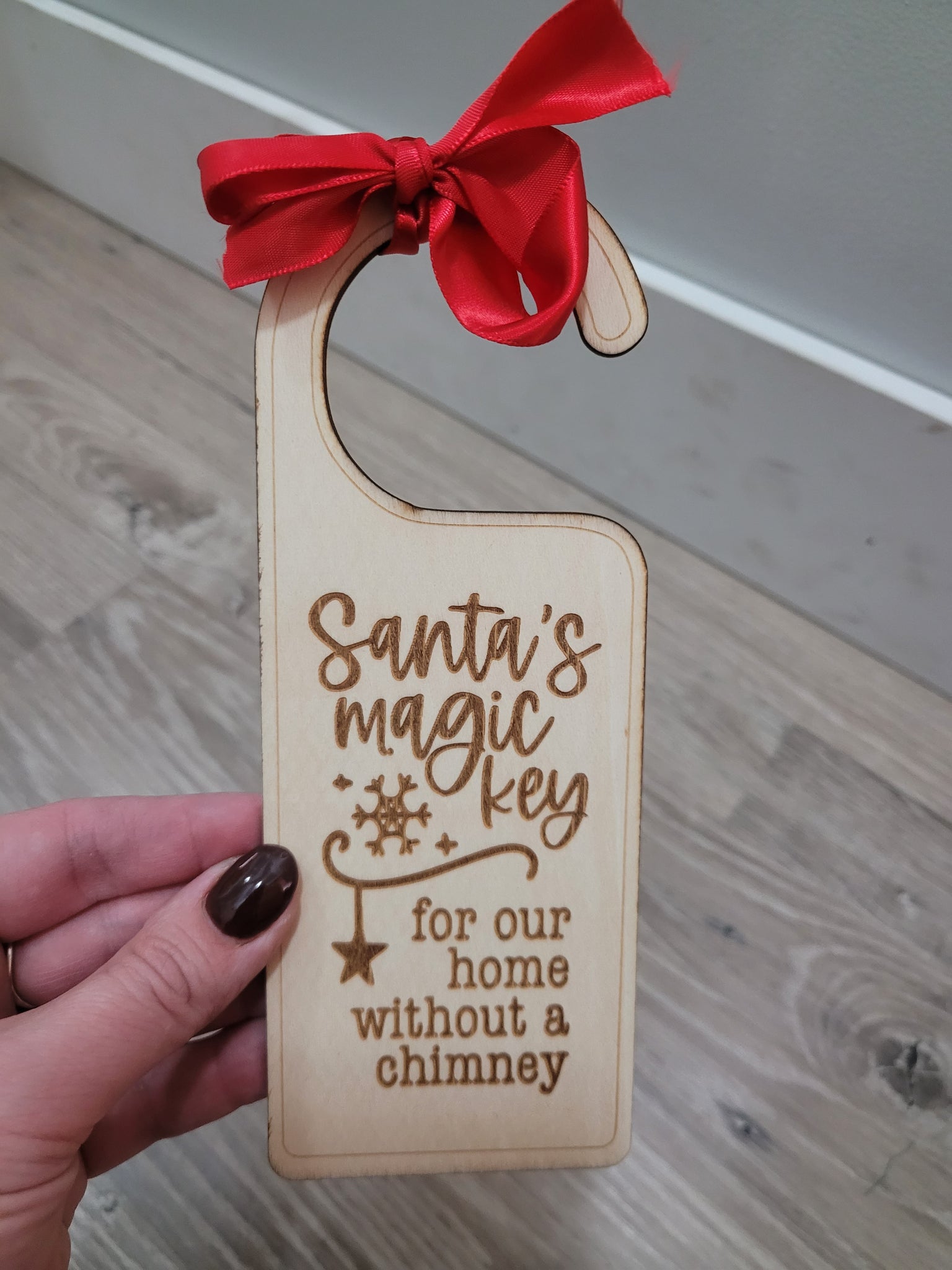 Metal Santa's Key adorned in a checkered ribbon & wooden door hanger for Santa's Key